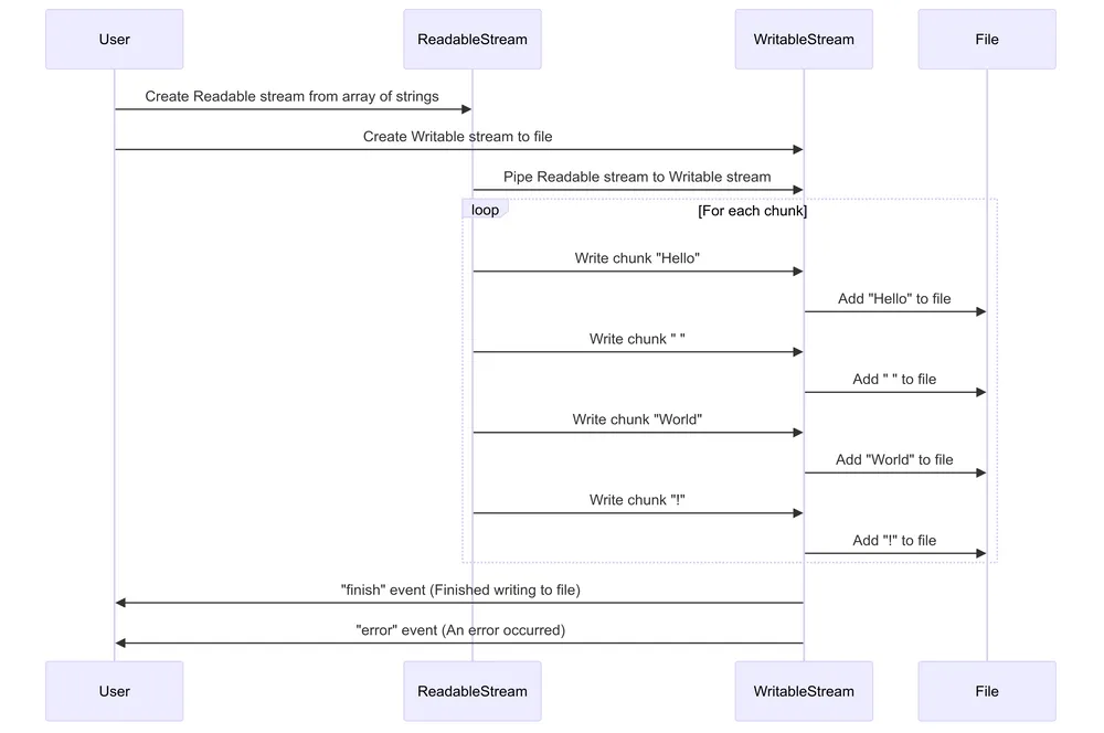 In our previous post, we started with the mental model that Readable streams are like water taps. In the same way that we can turn on the tap, change the flow rate, or turn it off, a Readable stream provides data in chunks that we can consume, pause, resume, or end. 在我们之前的文章中,我们从 Readable 流就像水龙头的心智模型开始。就像我们可以打开水龙头、更改流速或关闭它一样,Readable 流以块的形式提供数据,我们可以使用这些数据块、暂停、恢复或结束这些数据。